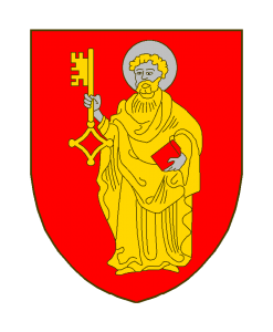De gueules au Saint Pierre habilé d’or, nimbé, tenant dans sa main dextre une clé d’or, le panneton vers la dextre, et dans sa main senestre un livre de gueules.