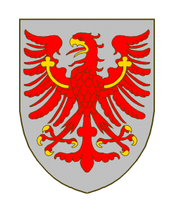 D’argent à l’aigle de gueules, languée du même et armée d’or. Chaque aile est chargée d’un demi-cercle treflé d’or.