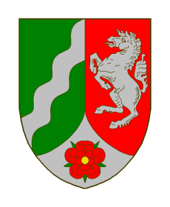 Parti: Au I de sinople à la barre ondée d’argent. Au II de gueules au cheval rampant d’argent. Enté en pointe d’argent à la rose de gueules, boutonné et feuillé d’or.