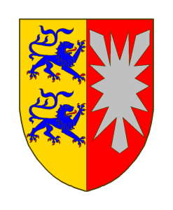 Parti: au I d’or à deux lions passants contournés d’azur (Schleswig/Danemark), au II de gueules à un “Nesselblatt” d’argent (Holstein/Schauenburger).