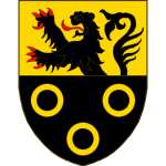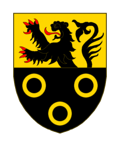 Coupé: Au I d’or au lion issant de sable, armé et lampassé de gueules, au II de sable à trois anneaux d’or.