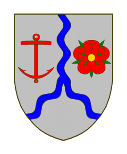 Wappen: In Silber ein blauer Wellengüpel, begleitet rechts von einem gesenkten roten Anker, links von einer heraldischen roten Rose.