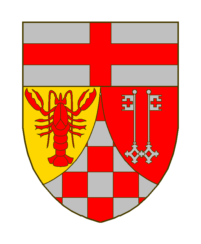 Unter silbernem Schildhaupt mit durchgehendem roten Kreuz eine eingebogene, aufsteigende, von rot und Silber geschachtete Spitze; rechts in Gold ein roter Krebs, links in Rot zwei aufrechte silberne Schlüssel, deren Schließblätter halb aufeinander gelegt sind.