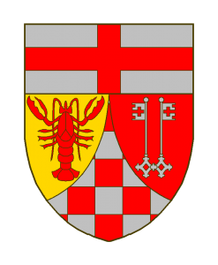 Unter silbernem Schildhaupt mit durchgehendem roten Kreuz eine eingebogene, aufsteigende, von rot und Silber geschachtete Spitze; rechts in Gold ein roter Krebs, links in Rot zwei aufrechte silberne Schlüssel, deren Schließblätter halb aufeinander gelegt sind.