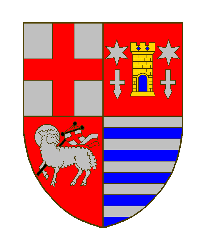 Geviert: 1 rotes Balkenkreuz in Silber; 2 goldener Turm mit blauem Tor in Rot, beseitet von je einem silbernen Stern über silbernem Nagelspitzkreuz; 3 silbernes Salvatorlamm in Rot; 4 neunmal geteilt von Silber und Blau.