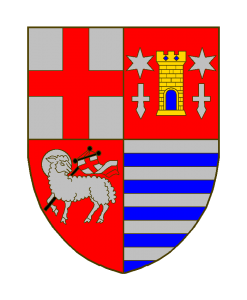 Geviert: 1 rotes Balkenkreuz in Silber; 2 goldener Turm mit blauem Tor in Rot, beseitet von je einem silbernen Stern über silbernem Nagelspitzkreuz; 3 silbernes Salvatorlamm in Rot; 4 neunmal geteilt von Silber und Blau.