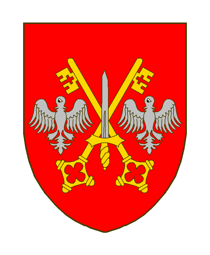 ;De gueules à deux clefs d’or en sautoir à l’épée d’argent garnie d’or brochant sur le tout ., le tout accompagné à dextre et senestre de deux alérions d’argent.