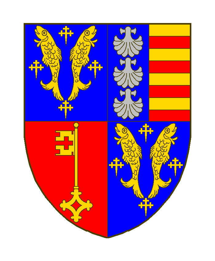 Écartelé: au premier et au quatrième d’azur aux deux bars adossés d’or, accompagnés de quatre croisettes recroisetées au pied fiché du même, au deuxième parti au I d’azur aux trois coquilles d’argent rangées en pal et au II fascé d’or et de gueules de huit pièces, au troisième de gueules à la clef d’or en pal.