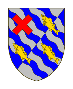 Taillé bandé ondé contre bandé ondé d’azur et d’argent de dix pièces chargé en chef à dextre d’un sautoir alésé de gueules et de trois sandres d’or disposés 1 – 2.