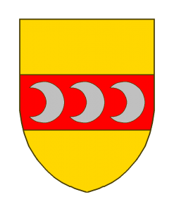 D’or à la fasce de gueules chargée de trois croissants tournés d’argent.Cimier (Casque couronné):