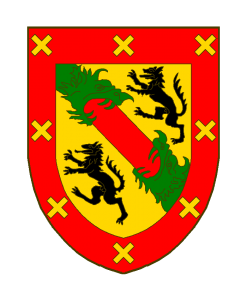 D’or à la bande de gueules engoulée de deux têtes de dragon de sinople, accompagnée de deux loups de sable, à la bordure de gueules chargée de huit flanchis (ou sautoirs ) d’or.