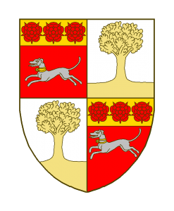 écartelé aux I et IV comme ci-dessus (De gueules à la levrette courant d’argent, accolée et bouclée d’or, au chef du même chargé de trois roses de gueules), aux II et III à un arbre terrassé.
