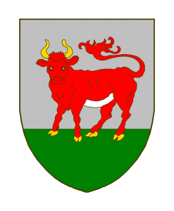 D’argent au taureau (ou boeuf) de gueules, le ventre blanc, posé sur une terrasse de sinople (parfois les cornes et les sabots d’or)