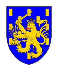 D’azur billeté d’or au lion brochant couronné dune couronne royale tenant de sa dextre une épée tirée et de sa senestre un faisceau de flèches liées d’un ruban le tout d’or le lion lampassé de gueules