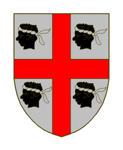 D’argent à la croix de gueules cantonnée de quatre têtes de more de sable tortillées d’argent.