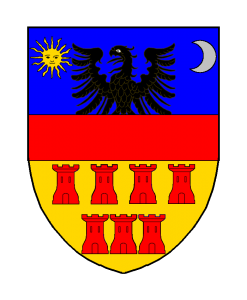 Coupé d’azur et d’or, à la fasce de gueules brochant, accompagnée en chef d’une aigle issante de sable, becquée d’or, accostée à dextre d’un soleil d’or, à sénestre d’un croissant tourné ou contourné d’argent, en pointe sept tours de gueules posées 4 – 3