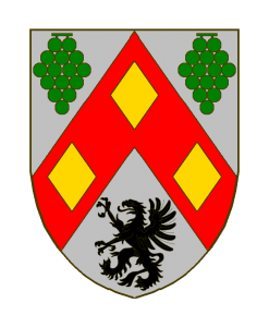 D’argent au chevron de gueules chargé de trois losanges d’or, accompagné en pointe d’un griffon de sable et en chef de deux grappes de vigne tigées de sinople