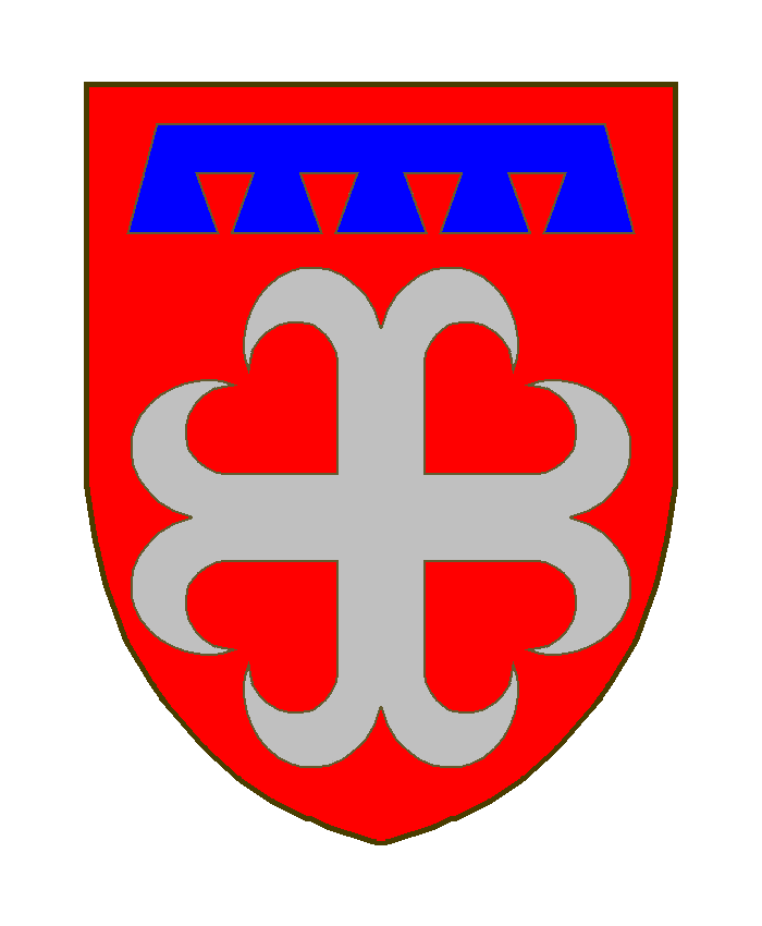 De gueules à la croix ancrée d’argent chargée en chef d’un lambel de cinq pendants d’azur