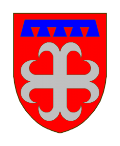 De gueules à la croix ancrée d’argent chargée en chef d’un lambel de cinq pendants d’azur