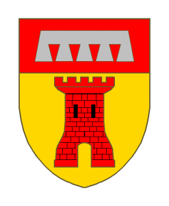 D’or à la tour ouverte, crénelée cinq pièces, de gueules, maçonnée de sable, au chef gueules d’un lambel cinq pendants d’argent