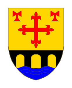D’or à la croix fleurdelisée de gueules accostée en chef de deux béquilles de Saint Antoine du même et accompagnée en pointe d’un pont de trois arches de sable mouvant de flancs, posé sur une rivière d’azur mouvant de la pointe