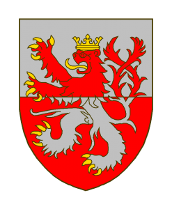 Coupé d’argent et de gueules, au lion de l’un en l’autre, armé, lampassé et couronné d’or, la queue fourchue et passée en sautoir
