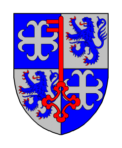 Ecartelé: aux I et IV d’azur à la croix ancrée d’argent: aux II et III d’argent au lion d’azur armé et lampassé de gueules; à la clef de gueules posée en pal, le panneton en haut, brochant sur le tout