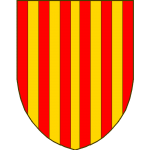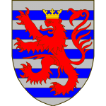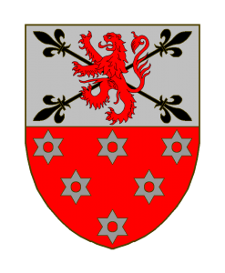 Coupé d’argent à deux bâtons fleurdelisés de sable posés en sautoir chargés en abîme d’un lion de gueules, et de gueules à six molettes d’argent posées 3-2-1