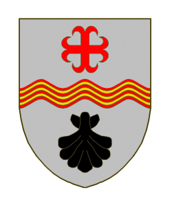 D’argent à la fasce ondée de gueules chargée de trois trangles également ondées d’or, ladite fasce accompagnée en chef d’une croix ancrée de gueules, en pointe d’une coquille de sable
