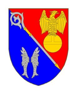 Tranché de gueules à un monde d’or sommé d’une aigle romaine du même, et d’azur à deux bars adossés d’argent; à une crosse du même garnie d’or, posée en bande et brochant sur la partition