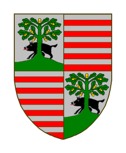 Ecartelé: aux I et IV d’argent au sanglier de sable défendu d’argent, langué de gueules, arrêté derrière un tronc d’un chêne de sinople; au II et III burelé d’argent et de gueules