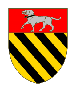 D’or à quatre bandes de sable, au chef de gueules chargé d’un chien braque d’argent colleté de sable