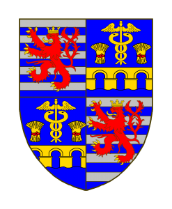 Ecartelé: aux I et IV les armoiries nationales, aux II et III d’azur à un pont d’or sur une eau d’azur, en chef un caducée et deux gerbes de blé d’or, liées de gueules