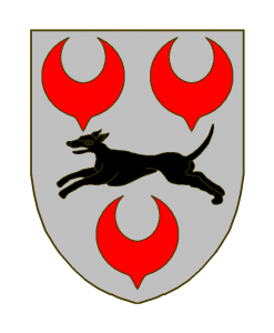 D’argent au lévrier courant de sable accompagné de trois feuilles de nénuphar de gueules