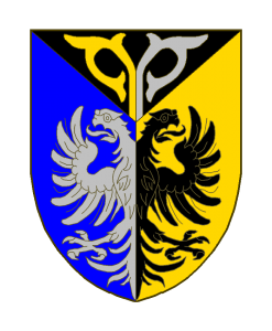 Tiercé en pairle; à dextre d’azur à la demi-aigle d’argent, à senestre d’or à la demi-aigle de sable, au chef du même chargé de deux crosses d’abbé adossées mises en pal, mouvant de la partition, celle de dextre d’or, celle de senestre d’argent