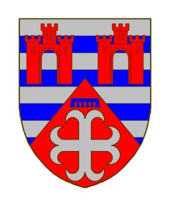 De gueules à la croix ancrée d’argent surmontée d’un lambel de cinq pendants d’azur, mantelé d’un fascé d’argent et d’azur de huit pièces chargé en chef de deux portes de ville à trois tours de gueules