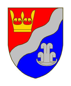 Taillé de gueules et d’azur à la barre ondée d’argent brochante accompagnée en chef d’une couronne d’or et en pointe d’une fontaine d’argent