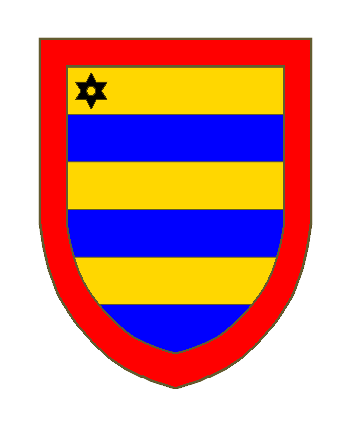 Fascé d’or et d’azur, la fasce du chef chargée à dextre d’une molette de sable, à la bordure de gueules