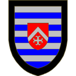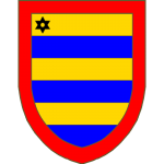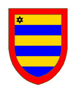 Fascé d’or et d’azur, la fasce du chef chargée à dextre d’une molette de sable, à la bordure de gueules