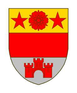 Coupé d’or et d’argent, à la fasce de gueules brochant, accompagnée en chef d’une rose à six feuilles de gueules entre deux étoiles du même, en pointe d’une porte ouverte du même