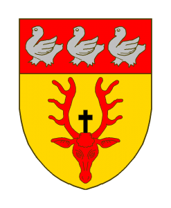 D’or au rencontre de cerf de gueules, surmonté d’une croix latine alésée de sable; au chef de gueules chargé de trois merlettes d’argent