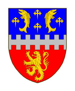 Coupé; en chef d’azur à deux bars adossés d’or, cantonnés de quatre croisettes recroisettées au pied fiché du même; en pointe de gueules au lion d’or; à la fasce bretessée d’argent brochant sur la partition.
