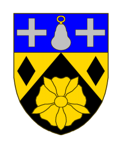 De sable à la quintefeuille feuillée d’or, chapé d’or à deux losanges de sable, au chef d’azur à la perle en poire d’argent, sertie et annelée d’or, accostée de deux croisettes d’argent