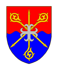 Coupé-ondé de gueules et d’azur à trois crosses d’abbé d’or, deux affrontées et passées en sautoir, la troisième renversée et mise en pal; à la croix ancrée d’argent en abîme brochant sur le tout