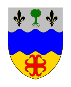 Coupé d’argent et d’or, à la fasce ondée d’azur brochant sur la partition, accompagnée en chef d’un arbre arraché de sinople accosté de deux fleurs de lis de sable, en pointe d’une croix ancrée de gueules