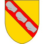 D’or à la bande de gueules, chargée de trois moufles senestres d’argent appaumées, posées dans le sens de la bande