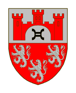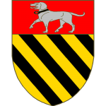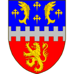 Coupé d’argent à une porte de ville ouverte à trois tours de gueules, l’ouverture de la porte chargée d’une anille de sable, et de gueules à trois lions d’argent posés 2 et 1
