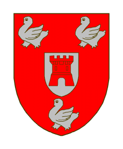 De gueules à l’écusson d’argent chargé d’une tour crénelée et ouverte de gueules, accompagné de trois merlettes d’argent, deux en chef et une en pointe
