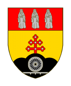D’or à la montagne à trois coupeaux celui du milieu plus élevé de sable chargée d’une roue motrice de locomotive posée sur un rail le tout d’argent ladite montagne sommée d’une croix patriarcale de gueules ornée de sept besants d’argent au chef de gueules chargé de trois vierges d’argent rangées en fasce