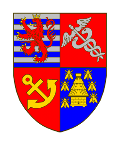 Ecartelé: au Ier burelé d’argent et d’azur de dix pièces à un lion rampant de gueules couronné, lampassé et armé d’or; au IIeme de gueules à un caducée d’argent posé en bande; au IIIeme de gueules à une ancre d’argent posée en bande; au IVeme d’azur à une ruche d’or et des abeilles volantes du même. L’écu sommé d’une couronne de huit fleurons dont cinq sont seulement visibles